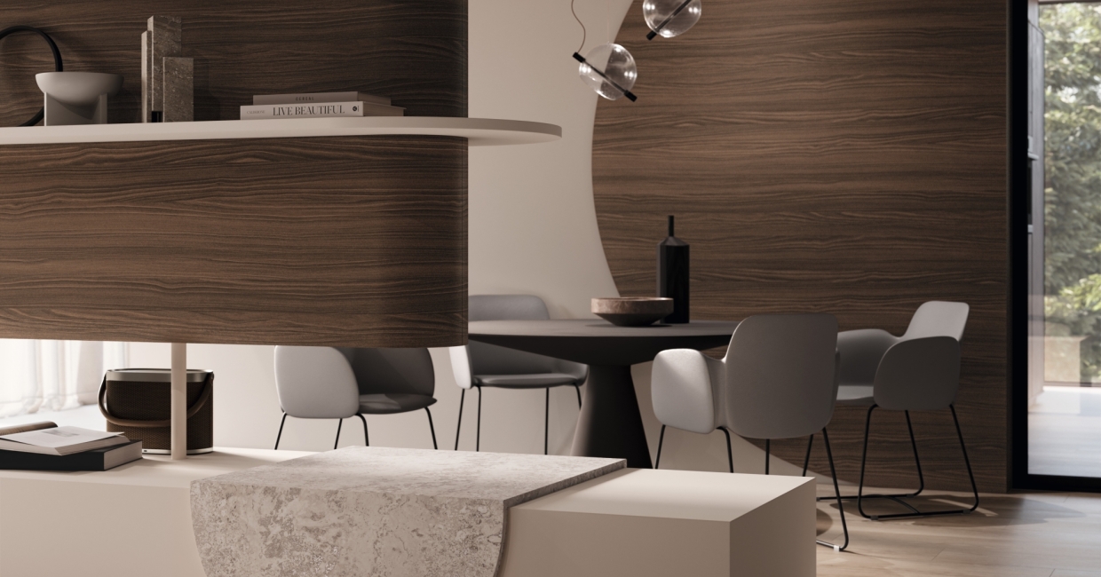 When beige replaces bright white, it is contrasted by warm brown tones. However, these are not one-tone, but appear as elegant and calm woodgrains in the Italian style, adding a natural accent to interior designs.