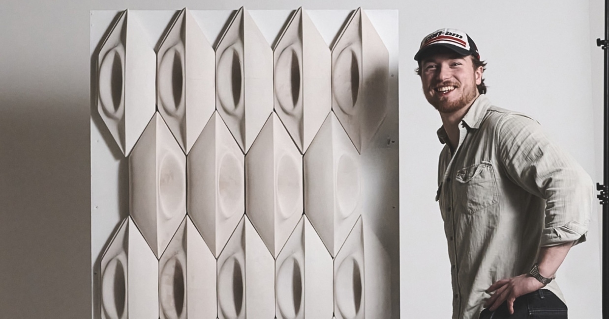 David McGill presents Ruvi Acoustic Tile, a slip-cast ceramic wall tile designed to improve the acoustic and sensory quality of public infrastructure such as the London Underground. Inspired by ancient Roman acoustic principles, Ruvi integrates Helmholtz resonators into a modular ceramic form that dampens targeted noise frequencies without relying on synthetic foams. Durable, locally manufacturable and made from 97% natural materials, Ruvi reframes ceramics as a permanent, human-centred acoustic solution for contemporary urban environments.