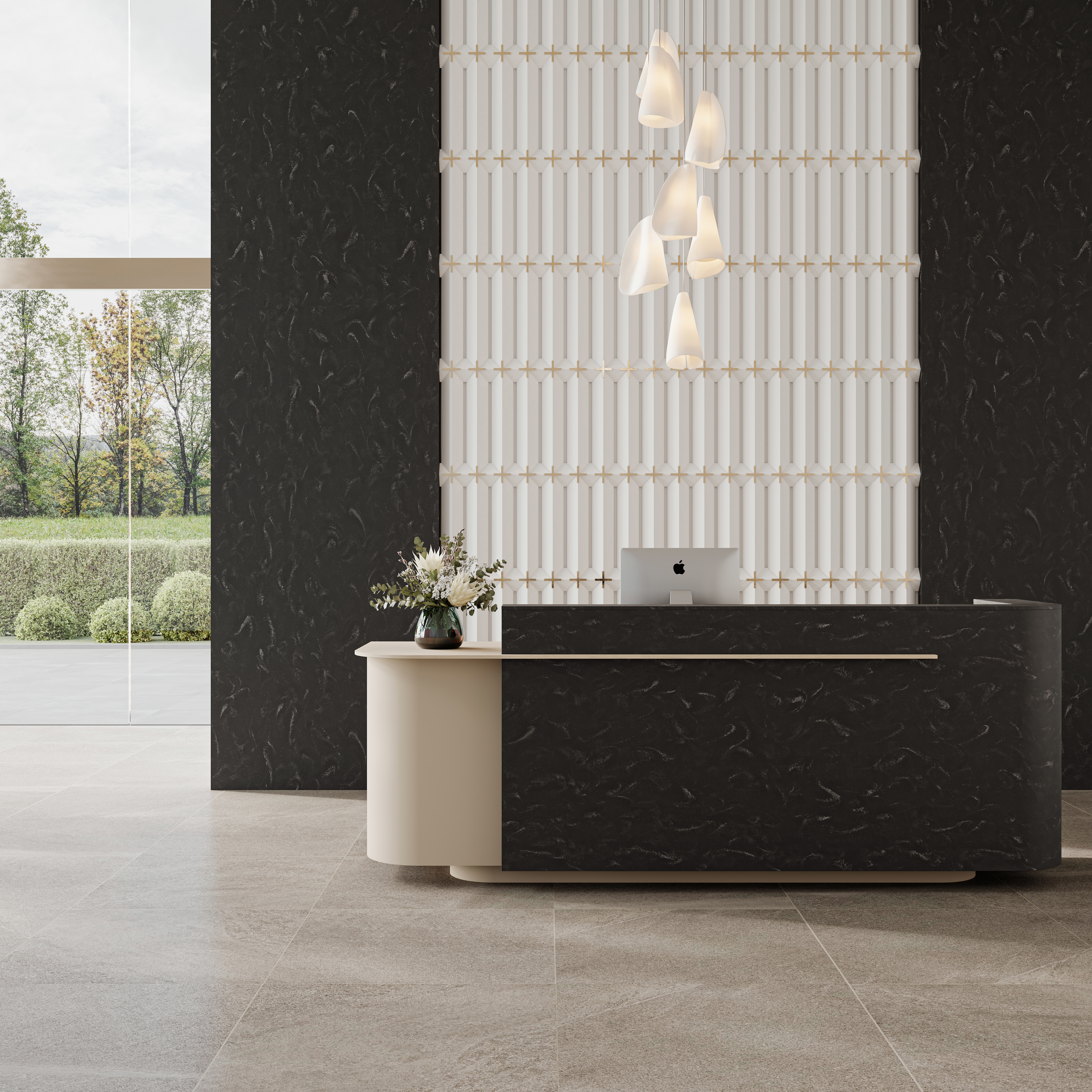 Within the Aurora & Marmo collection, Aurora Sage introduces a delicate green nuance to a stone-like texture, while Aurora Pluma and Aurora Nero explore swirling creamy patterns and dramatic dark tones, respectively, both incorporating SCS Certified recycled content.