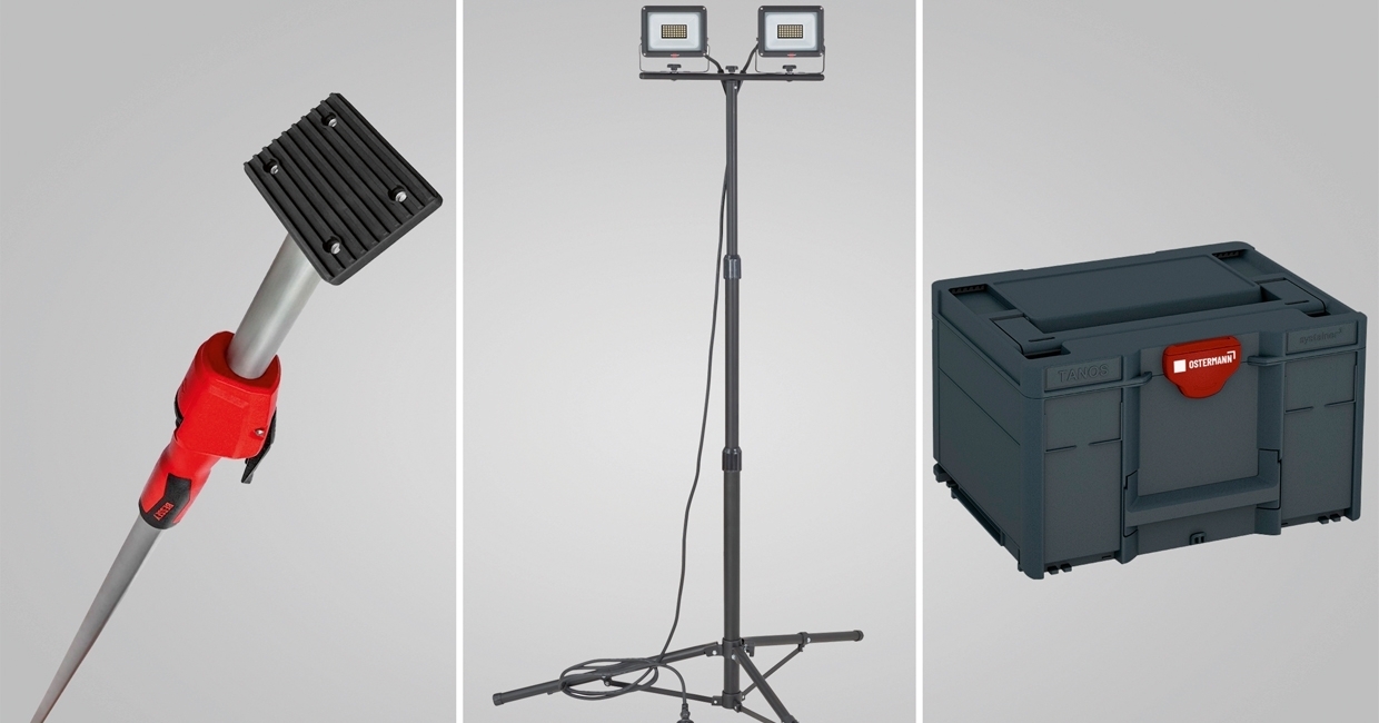 The height-adjustable Jaro LED construction light by Brennenstuhl is supplied with a tripod and is available in 1950, 2300 or 4800 lumens. Its three robust legs ensure secure footing, even on uneven ground, making it ideal for outdoor use. To provide reliable power on site, OSTERMANN also offers a range of high-quality cable drums, socket strips and extension cables.